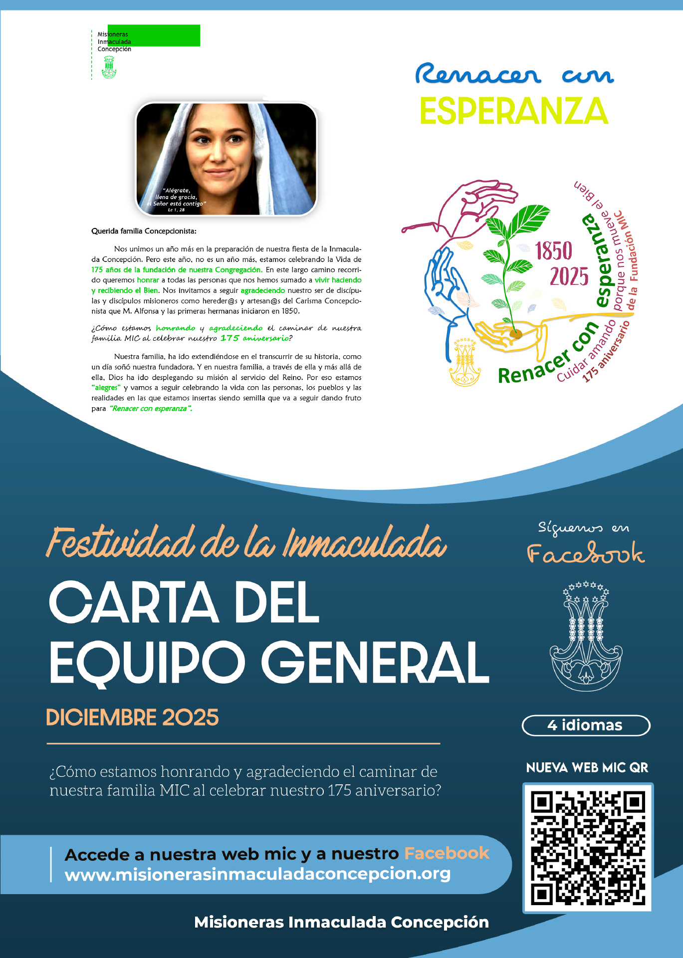 ¿Cómo estamos honrando y agradeciendo el caminar de nuestra familia MIC al celebrar nuestro 175 aniversario? Así comienza la hermosa carta que el Equipo General Mic ha elaborado para honrar y celebrar la festividad de la Inmaculada 2025. Haz clic en cualquiera de los idiomas reflejados más abajo y lee con atención todo el texto elaborado para poner en contexto esta importante fecha donde nuestra Madre vuelve a ser el centro de nuestra devoción.