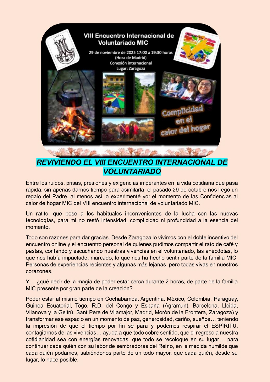 Entre los ruidos, prisas, presiones y exigencias imperantes en la vida cotidiana que pasa rápida, sin apenas darnos tiempo para asimilarla, el pasado 29 de octubre nos llegó un regalo del Padre, al menos así lo experimenté yo: el momento de las Confidencias al calor de hogar MIC del VIII encuentro internacional de voluntariado MIC. Un ratito, que pese a los habituales inconvenientes de la lucha con las nuevas tecnologías, para mí no restó intensidad, complicidad ni profundidad a la esencia del momento.