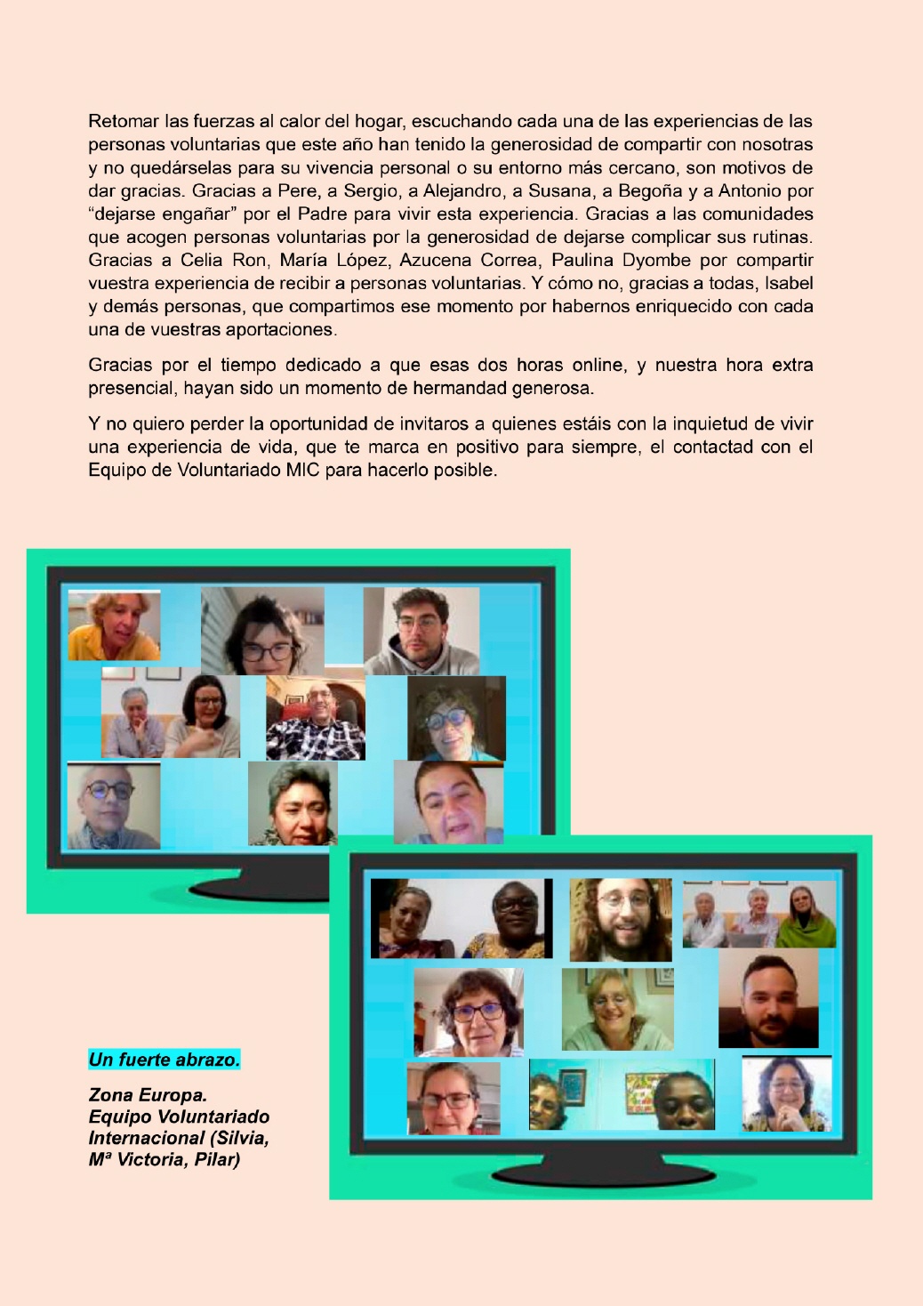 Gracias a Celia Ron, María López, Azucena Correa, Paulina Dyombe por compartir vuestra experiencia de recibir a personas voluntarias. Y cómo no, gracias a todas, Isabel y demás personas, que compartimos ese momento por habernos enriquecido con cada una de vuestras aportaciones. Gracias por el tiempo dedicado a que esas dos horas online, y nuestra hora extra presencial, hayan sido un momento de hermandad generosa. Y no quiero perder la oportunidad de invitaros a quienes estáis con la inquietud de vivir una experiencia de vida, que te marca en positivo para siempre, el contactad con el Equipo de Voluntariado MIC para hacerlo posible.