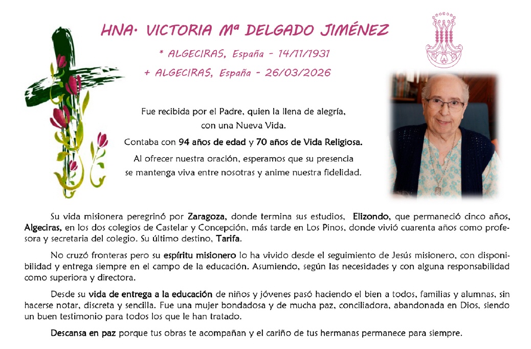 Fue recibida por el Padre, quien la llena de alegría, con una Nueva Vida. Contaba con 94 años de edad y 70 años de Vida Religiosa. Al ofrecer nuestra oración, esperamos que su presencia se mantenga viva entre nosotras y anime nuestra fidelidad. Su vida misionera peregrinó por Zaragoza, donde termina sus estudios, Elizondo, que permaneció cinco años, Algeciras, en los dos colegios de Castelar y Concepción, más tarde en Los Pinos, donde vivió cuarenta años como profesora y secretaria del colegio. Su último destino, Tarifa.