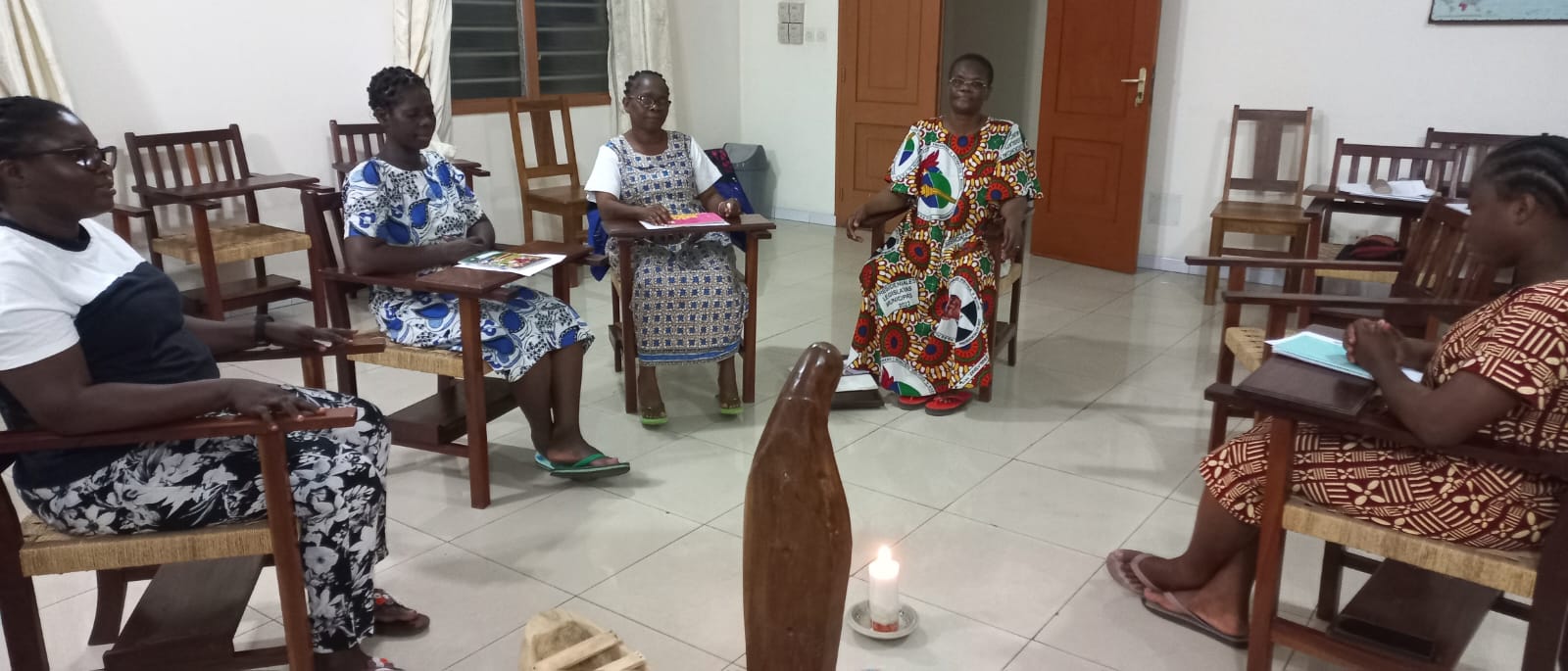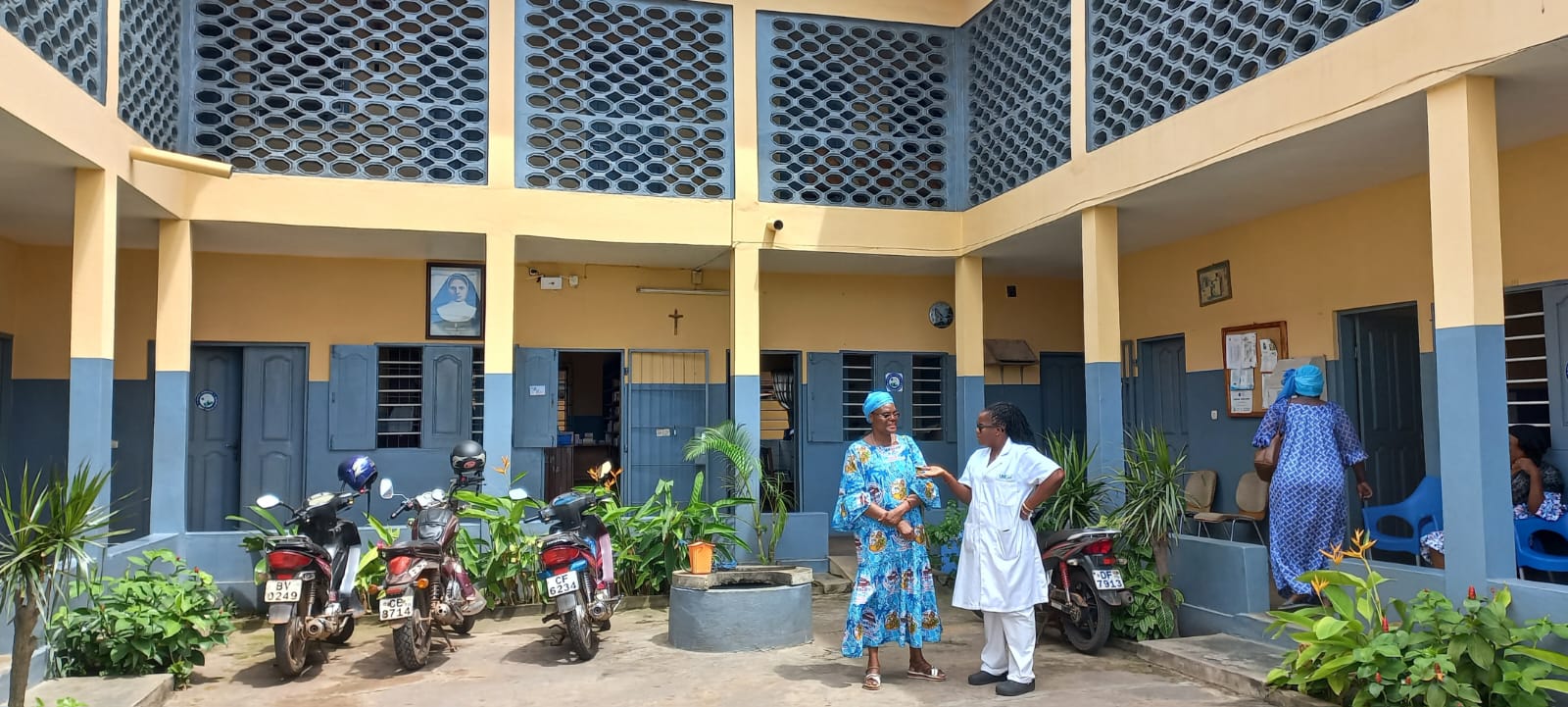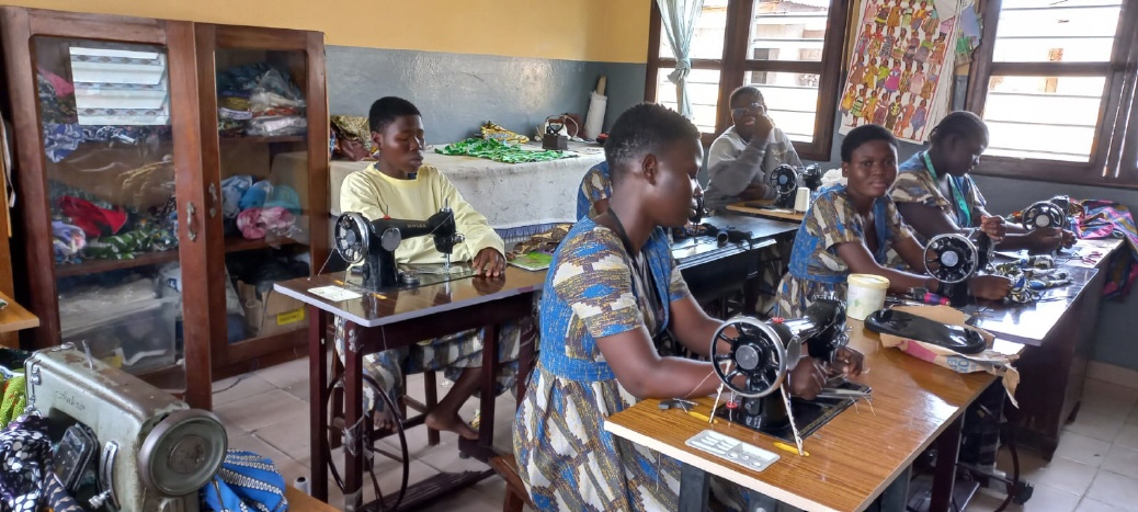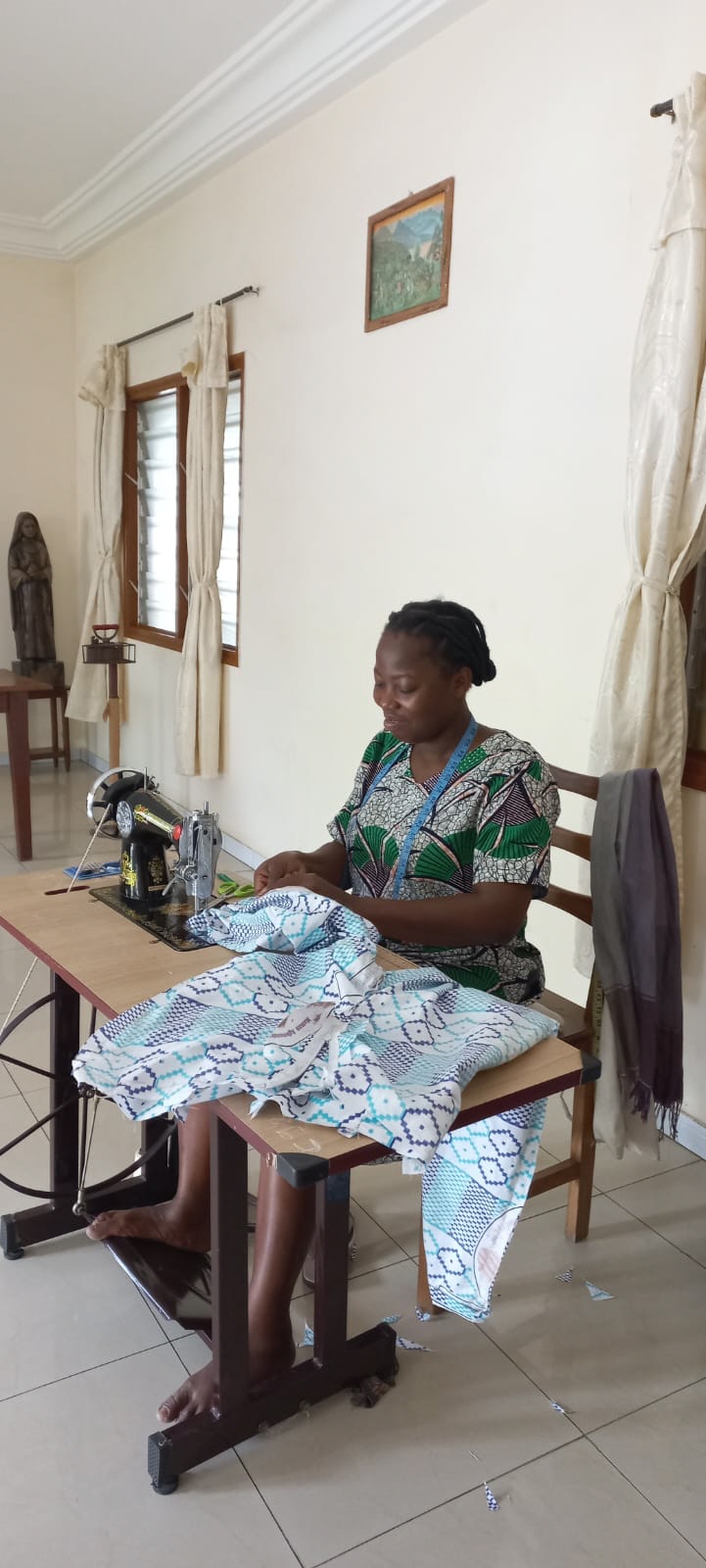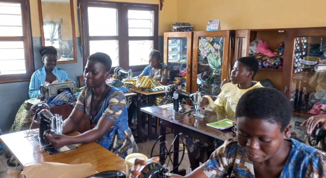 Continuamos compartiendo vida-misión con la comunidad de Lomé conociendo nuestro centro Médico Social Alfonsa Cavin, donde se realizan diferentes tipos de análisis, atención ginecológica, pediatría, farmacia… y saludando a todo el personal en sus diferentes servicios. Es aquí donde Céline Akpegnon, incorporada este curso a la comunidad, ofrece su saber, dedicando sus energías y tiempo a su especialidad, el laboratorio, y también ayudando en la farmacia. Recién llegada también Bénédicte Ekoe, después de finalizar sus estudios de enfermería, está colaborando en la farmacia del centro mientras espera poder hacer las prácticas de lo aprendido en algún hospital, y siguiendo su formación de juniorado. Junto a toda la parte médica, el centro acoge también un grupo de mujeres que están realizando su formación en costura durante tres años, con la posibilidad de acceder posteriormente a los exámenes oficiales. Es para ellas una posibilidad de abrirse al futuro y también de formarse a nivel personal. Es nuestra hermana Marie Agbokanli quien, dos días a la semana, les dedica su tiempo y les ayuda en la formación humana. Ida Montcho finalizó el curso pasado sus estudios en costura, este año está haciendo un tiempo de perfeccionamiento poniendo en práctica todo lo aprendido. Participa en la parroquia, de manera especial los domingos, acercando la Palabra a los niños y haciéndoles entender su mensaje en el momento de la eucaristía. Con su voz colabora y da vida a las celebraciones parroquiales y como juniora sigue también su formación.