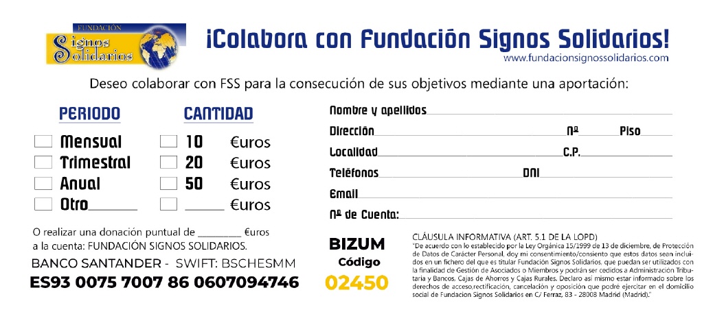 Puedes colaborar con nosotros aportando la cantidad que creas oportuna a través de dos medios: Bizum o transferencia bancaria. Los emails de contacto son fss@redmic.org o bien fundacionsignossolidarios@gmail.com